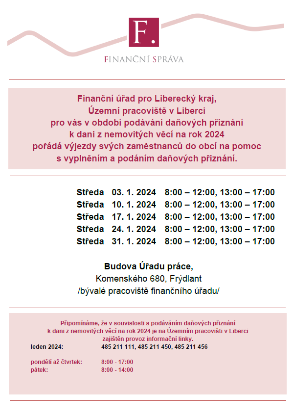 Finanční správa- termíny kdy budou zaměstnanci ve Frýdlantu a mohou Vám pomoci s vyplněním a podáním daňových přiznání 1