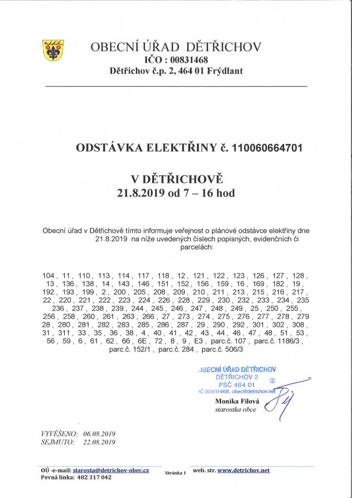 Odstávka elektřiny dne 21.08.2019 od 7-16 h. V příloze jsou uvedená čísla popisná, evidenční a parcely, kterých se to bude týkat.