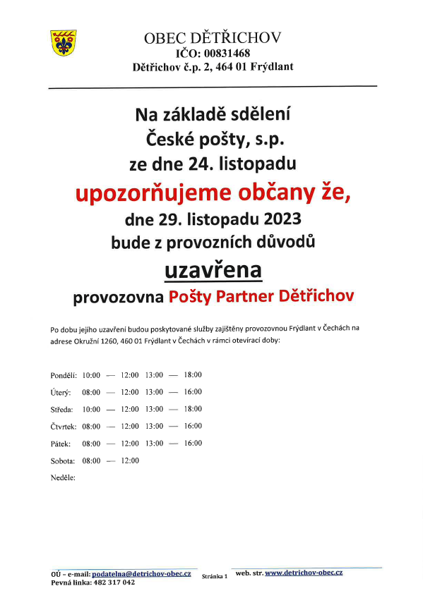 dne 29.11.2023 bude z provozních důvodů uzavřena provozovna Pošty Partner Dětřichov
