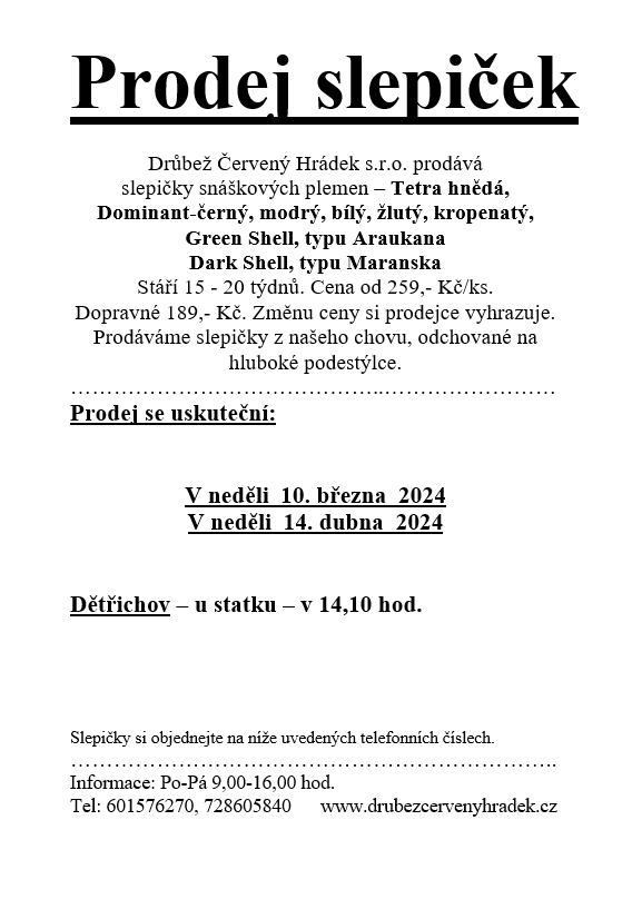 Slepičky si objednejte na níže uvedených telefonních číslech. Informace: Po-Pá 9,00-16,00 hod. Tel: 601576270, 728605840 www.drubezcervenyhradek.cz