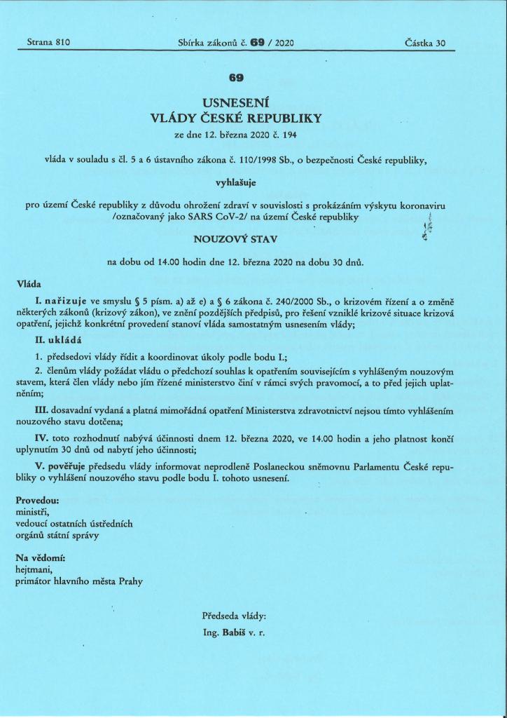 USNESENÍ VLÁDY ČR - NOUZOVÝ STAV OD 12.03.2020 - 14,00hod.