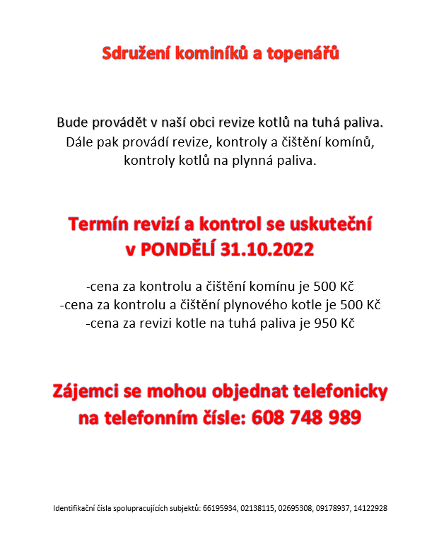 dne 31. 10. 2022 se uskuteční kontrola a revize komínů a kotlů na tuhá i plynná paliva.