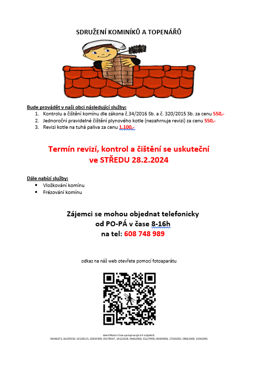 Termín revizí, kontrol a čištění se uskuteční ve STŘEDU 28.2.2024. Zájemci se mohou objednat telefonicky od PO-PÁ v čase 8-16h, na tel: 608 748 989.