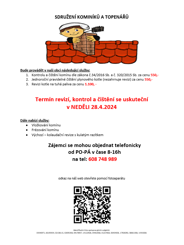 Bude provádět v naší obci v NEDĚLI dne 28.4. požadované kontroly a čištění komínů dle zákonu č. 34/2016 Sb.