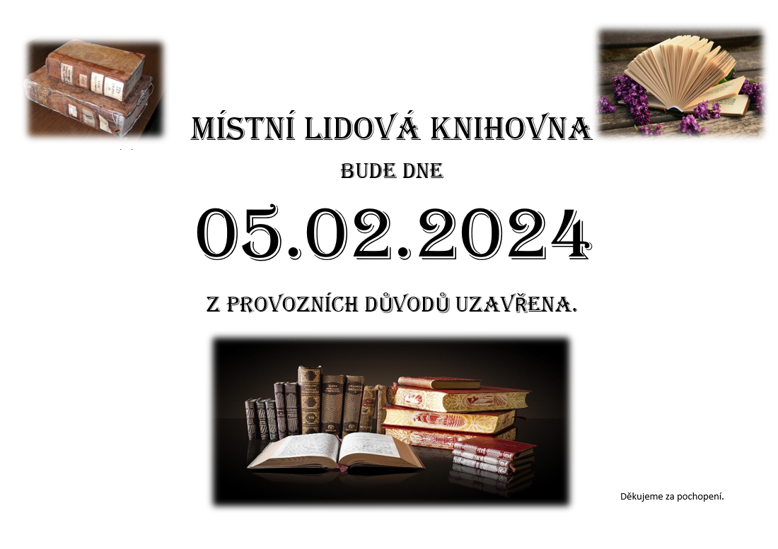 Dne 05.02.2024 bude Místní lidová knihovna Dětřichov z provozních důvodů uzavřena.