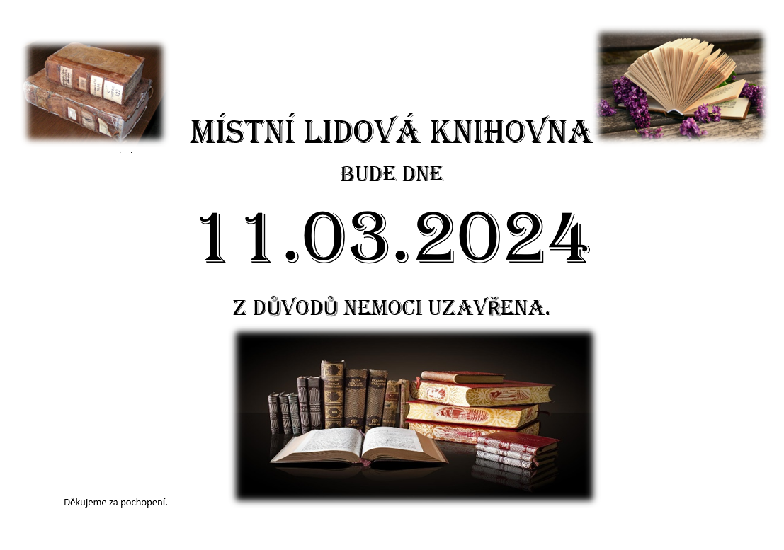 dne 11.03.2024 bude z důvodu nemoci uzavřena knihovna.